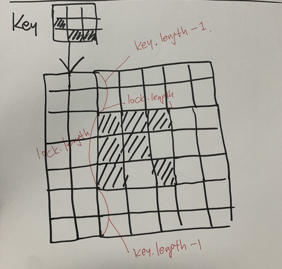 -key 역시 회전 후 패딩 시켜서 그 안에서 1에 해당하는 배열들을 수평(오른쪽 이동) 수직(아래쪽 이동) 시켜가며 lock에 해당하는 부분이 열리는지 확인한다