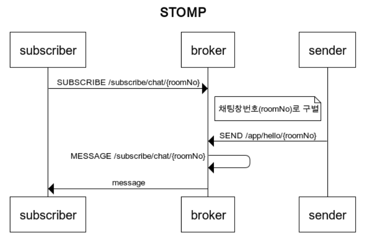 -subscriber가 채팅창 채널을 구독하겠다고 broker에게 알리면 해당 채널로(roomNo로 판별) sender가 메시지를 보낼 경우 broker가 메시지를 응답해주는 흐름이다.