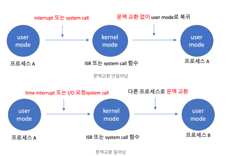 프로세스가 실행 상태일 때 시스템 콜이나 인터럽트가 발생하면 CPU의 제어권이 운영체제에게로 넘어와 원래 실행 중이던 프로세스의 업무를 잠시 멈추고 운영 체제 커널의 코드가 실행된다.