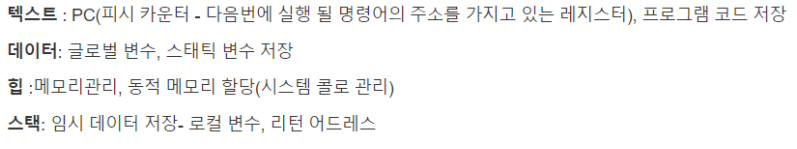 - 프로세스는 독립적이므로 다른 프로세스 code영역의 함수를 호출할 수 없다. 반면에 스레드는 code영역을 공유하므로 같은 프로세스 내의 다른 스레드의 함수를 호출할 수 있다.