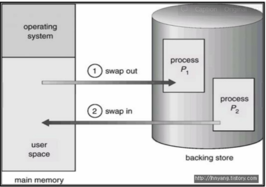 (예를 들어 10개의 프로세스가 메모리에 올라와있는데 11번째 프로세스가 실행됨. 올릴 공간은 없고 올라와있는 어떤 프로세스는 계속 이벤트를 기다림. 메모리 낭비가 됨 →그렇다면 기다리는 프로세스를 내리고 11번째 프로세스를 올리면 어떨까 내리는 행위가 바로 스왑 아웃이 됨.)