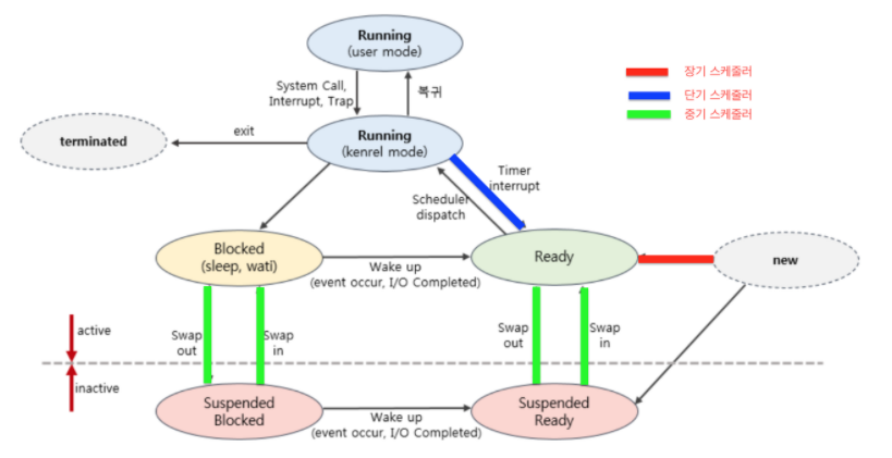 - suspended 상태의 프로세스는 메모리를 강제로 뺏긴 상태로 특정한 이유로 프로세스의 수행이 정지된 상태를 의미하며, 외부에서 다시 재개시키지 않는 이상 다시 활성화 될 수 없음.중기 스케줄러에 의해 디스크로 스왑 아웃된 프로세스의 상태가 대표적인 suspended상태라 할 수 있음. suspended ready와 suspended blocked가 있음