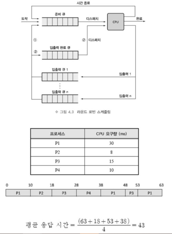 : 현대적인 CPU 스케줄링 각 프로세스는 동일한 크기의 할당 시간(time quantum)을 갖게 된다. 할당 시간이 지나면 프로세스는 선점당하고 ready queue의 제일 뒤에 가서 다시 줄을 선다.