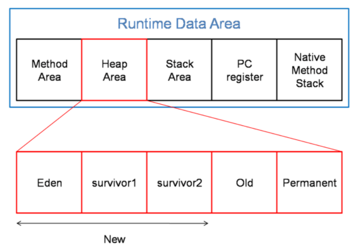 이 영역은 크게 Method Area, Heap Area, Stack Area, PC Register, Native Method Stack로 나눌 수 있다.