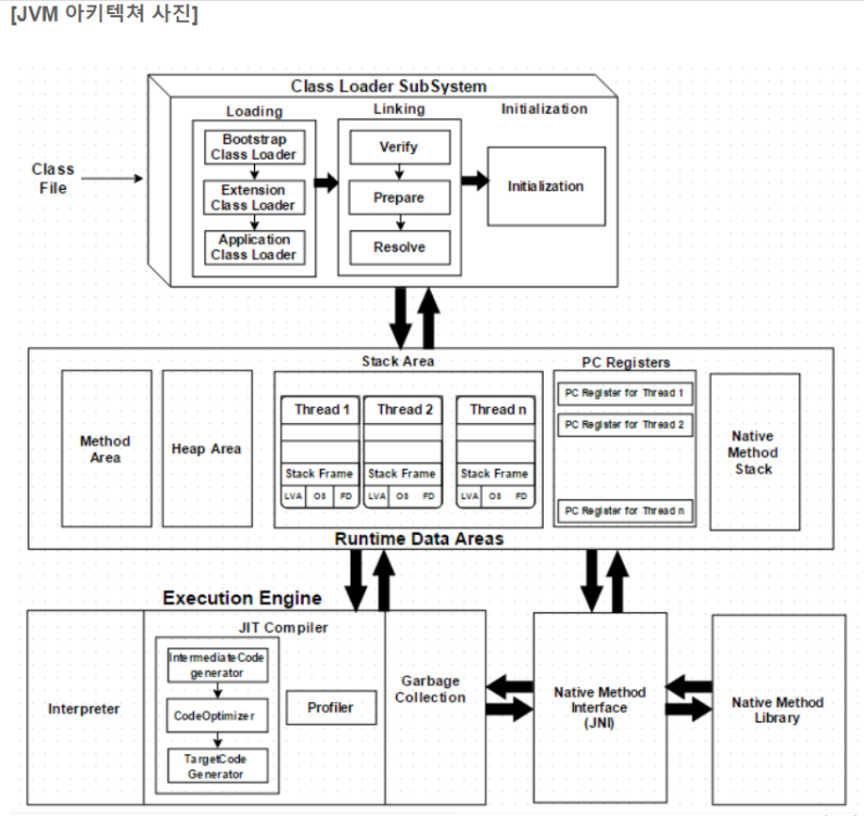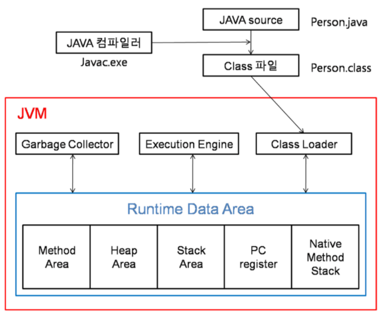 : .java파일 → 컴파일 → .class(바이트 코드) 파일 생성 이렇게 생성된 .class파일들을 엮어서 JVM이 운영체제로부터 할당받은 메모리 영역인 Runtime Data Area로 적재하는 역할을 한다. → class loader의 subsystem에서 파일을 로드, 링크, 초기화 함으로써 메모리에 적재.